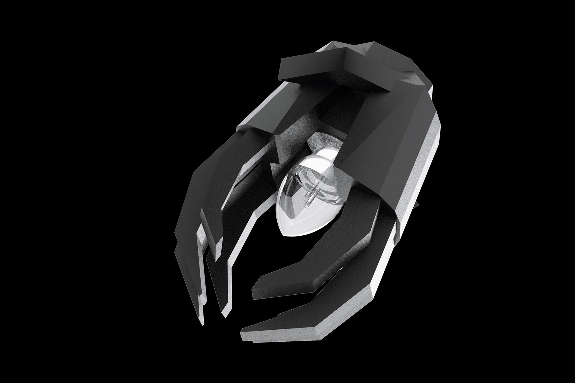 This hanging lamp project was part of a models and prototyping course. Initial concepts for me leaned towards a hand shape. I merged that concept into a more claw like structure, with a geometric build style. The restrictions I was given were the use of lasercut parts and accommodation for predetermined light casing. I 3d printed the hand base but lasercut the fingers to meet my requirements. Once I had all my components printed and cut, I attached the fingers to my base and did several coats of paint. I chose black to lean into the gothic style it was aligning with. When I printed the base, I made a slightly bigger hole compared to the lighting unit. from there, I added a sleeve to better slide in the lighting unit, which is especially useful when the bulb needs changed. Several iterations of the base size and finger shape occurred until a final silhouette was decided. the end result was a functional hanging lamp that was displayed at our end-of-year design show. I used rhino to create my part files and keyshot for a final render.